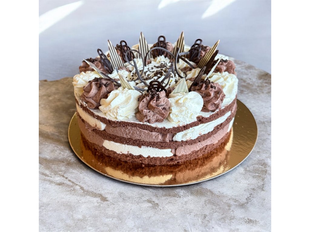 Dort se šlehačkovým krémem, bílá slazená a čokoládová šlehačka, tmavý korpus, čoko ozdoby