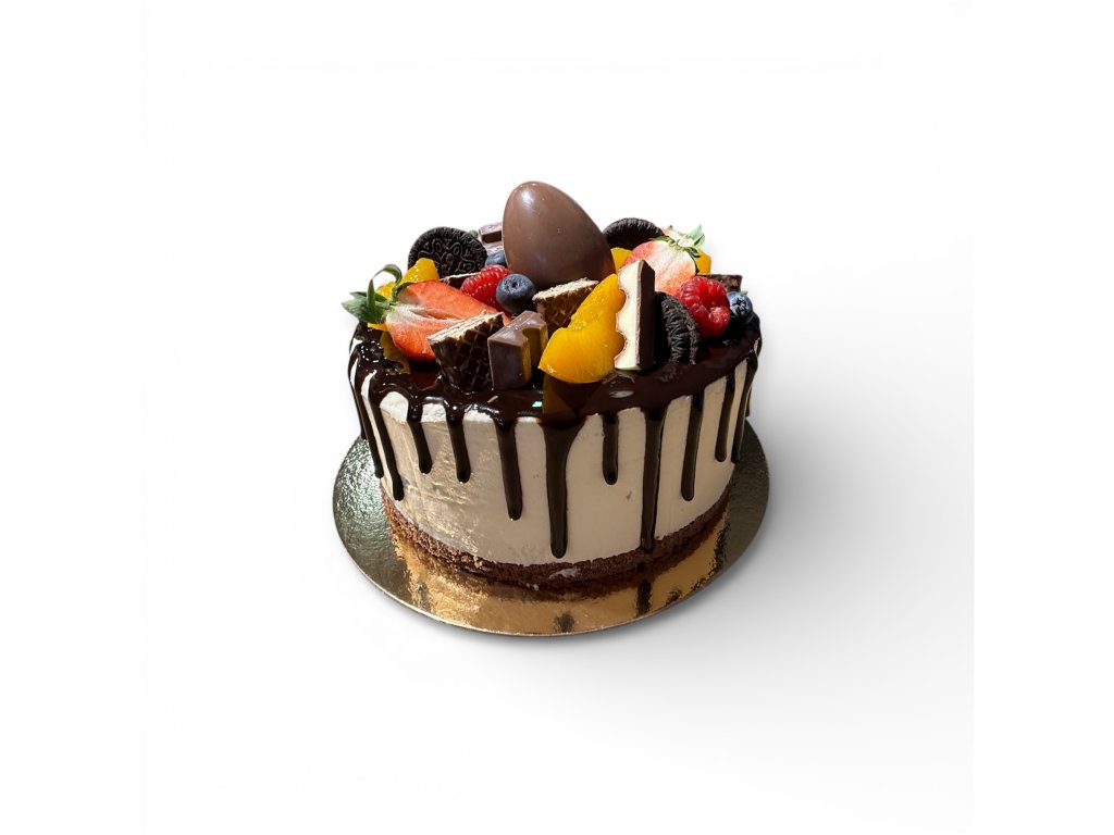 Šlehačkový dort se stékanou tmavou čokoládou, sušenkami, kinder vejcem a čerstvým sezónním ovocem