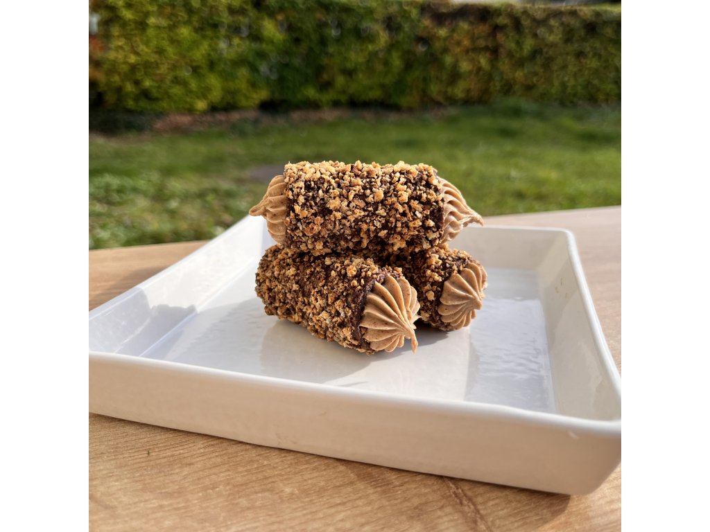Vaflová trubička s čokoládou a griliášem, šlehačkový krém.